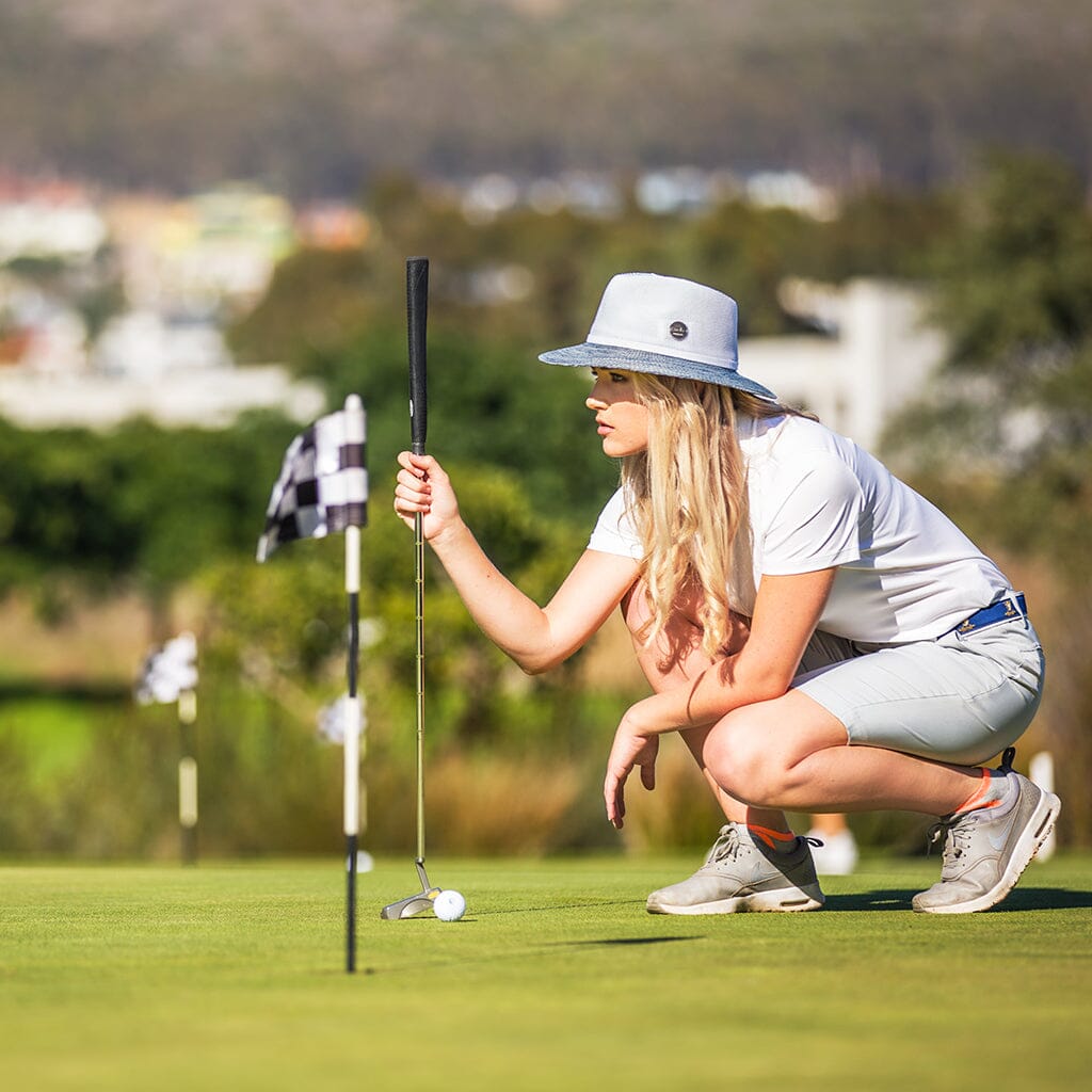 The Aston Fedora is the ideal lightweight ladies golf hat. This style comes with a unique hidden feature: a hidden magnet in the headband helps keep your golf ball-marker handy.
