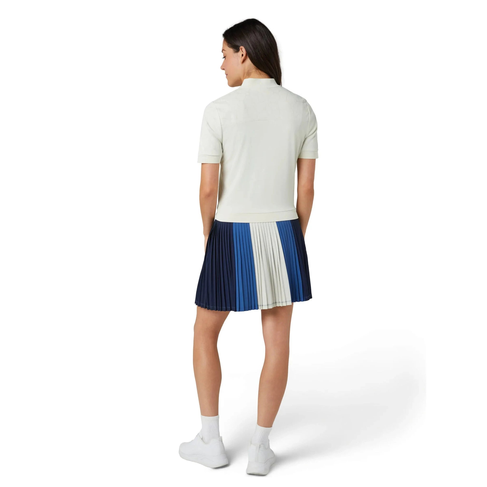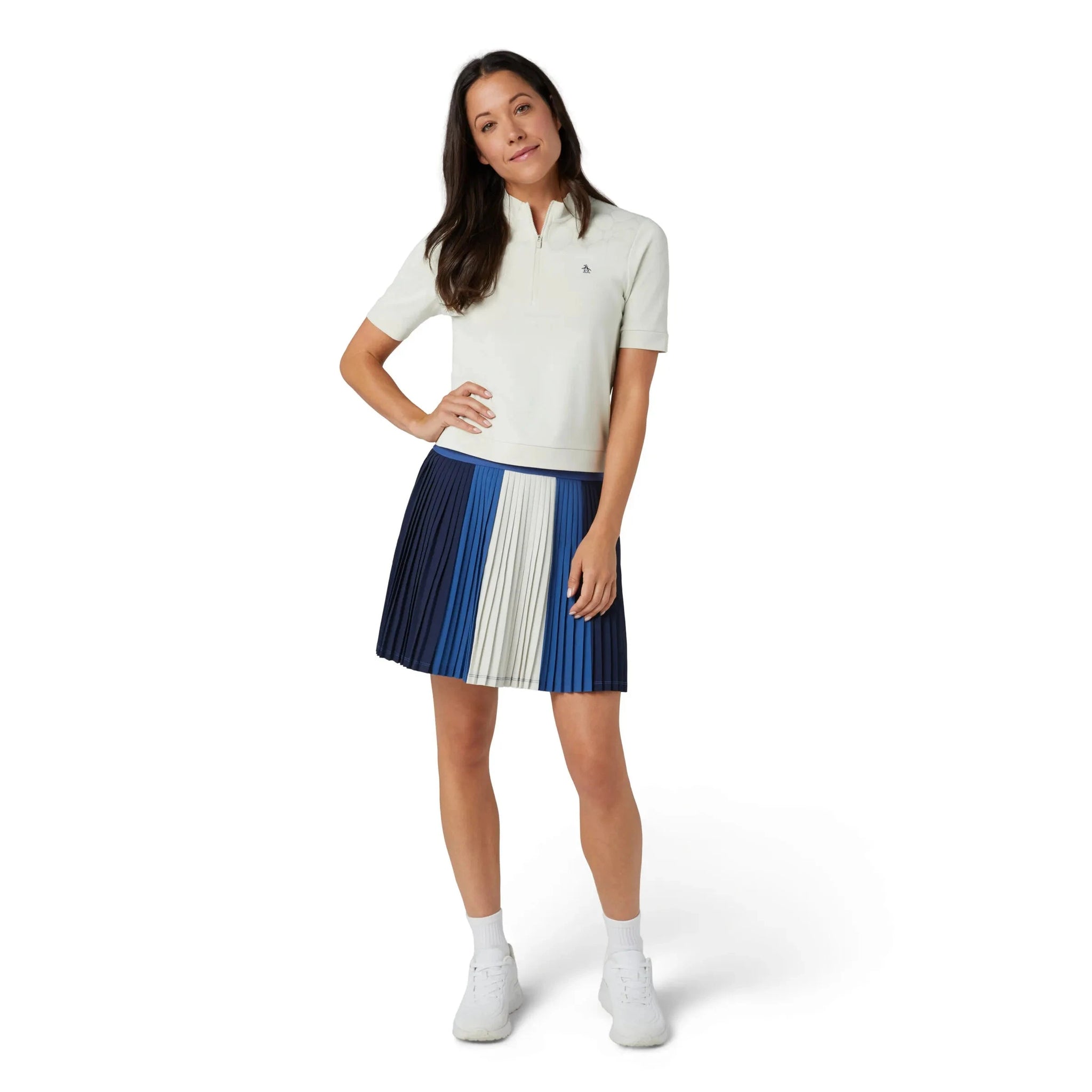 A laser-cut floral pattern and a classic stand-up collar make this women's short-sleeved shirt from Penguin a sophisticated choice. The airy and flexible top is made from a lightweight single knit and reinforced with stretch. Moisture-wicking technology keeps you fresh, while the recycled polyester construction makes it a smart choice for those looking to reduce their environmental footprint.