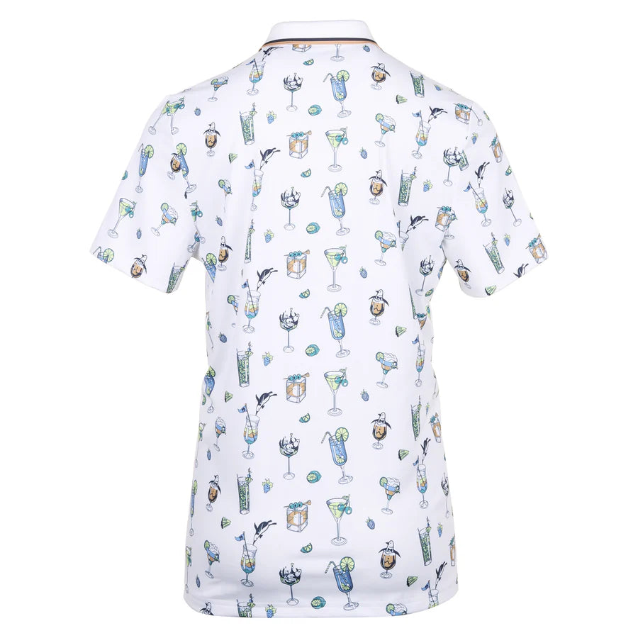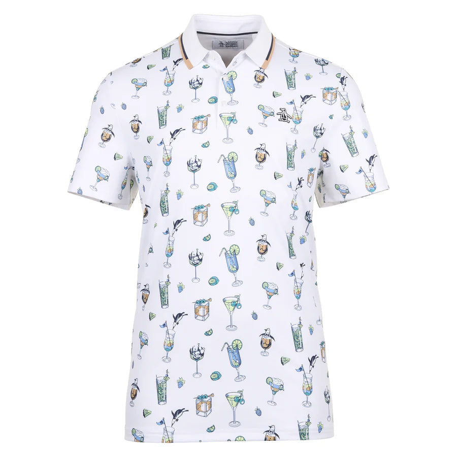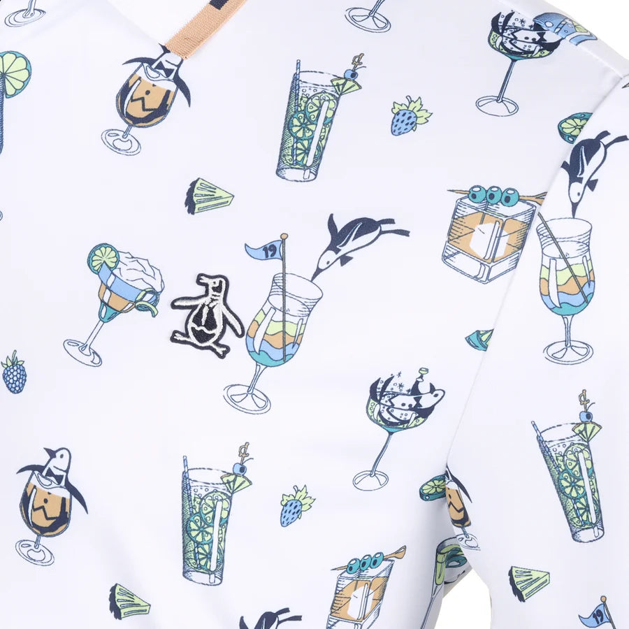 Mens Penguin 19th Hole Conversational Polo Shirt. A lightweight, breathable, technical golf shirt constructed in a soft touch fabric with moisture wicking self collar and 3 button placket, finished in a repeat print.