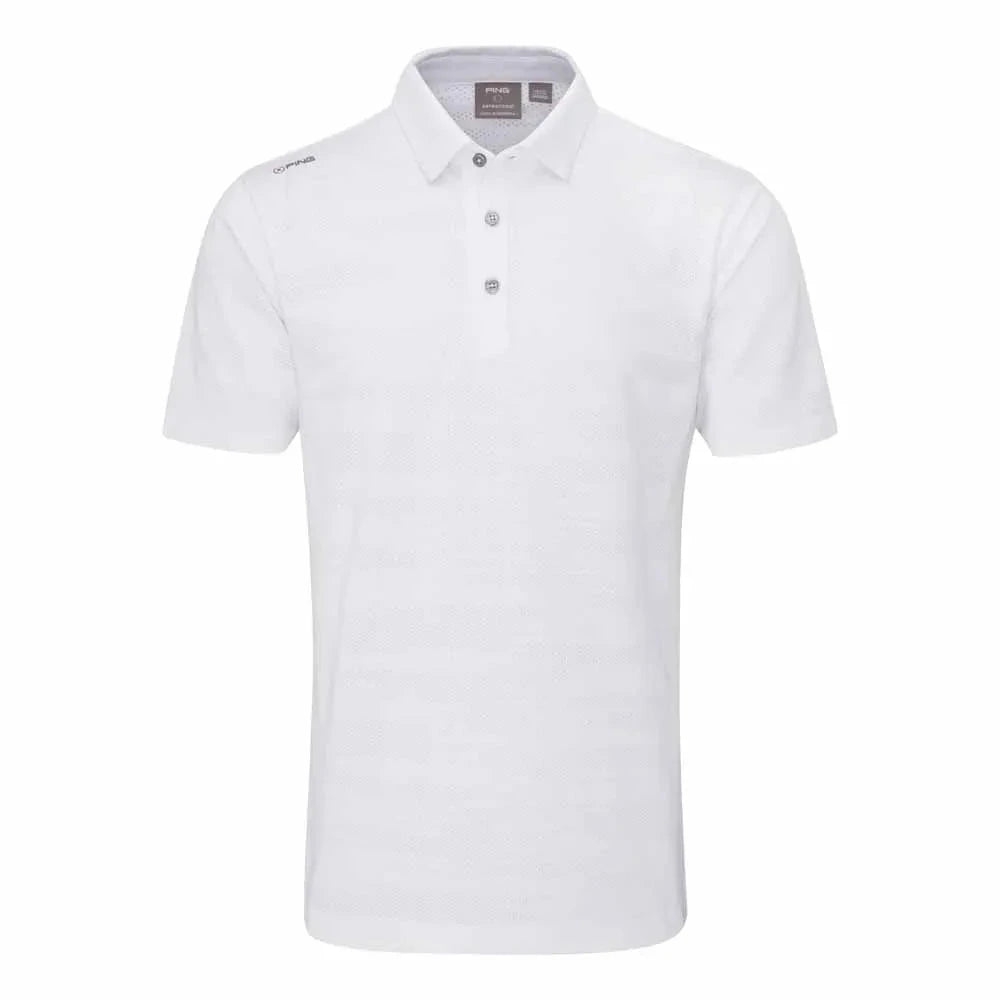 Modern performance meets clean design in the Claude Men’s Camo Mesh Polo Shirt in White. Crafted from lightweight camo-effect mesh, this polo offers superior ventilation and technical precision. A concealed button-down collar and three-button placket create a refined silhouette, complemented by rib detailing and PING logos for a mark of quality.