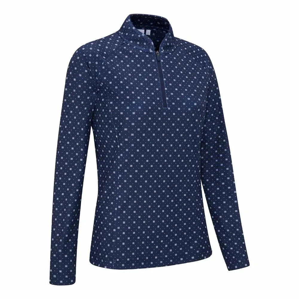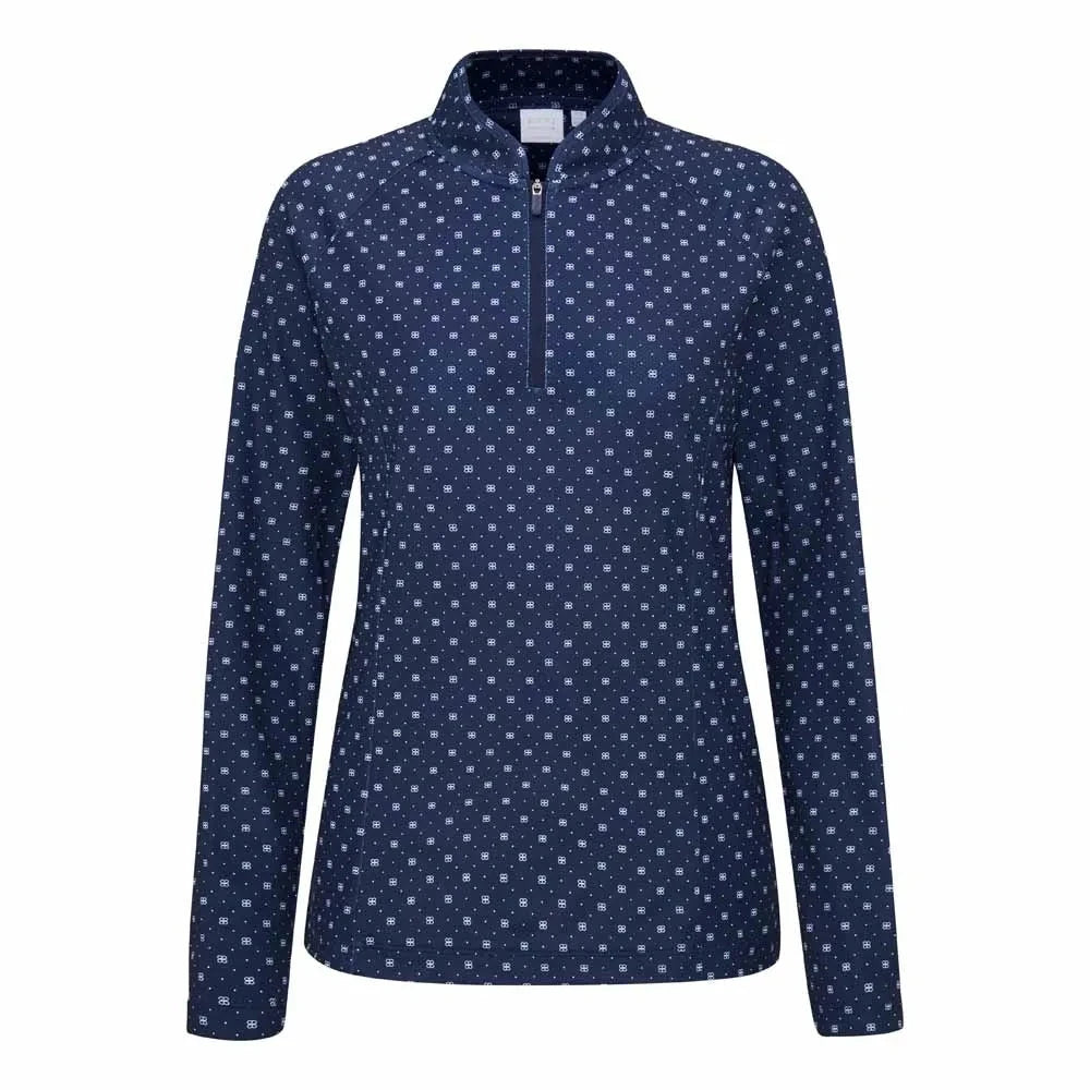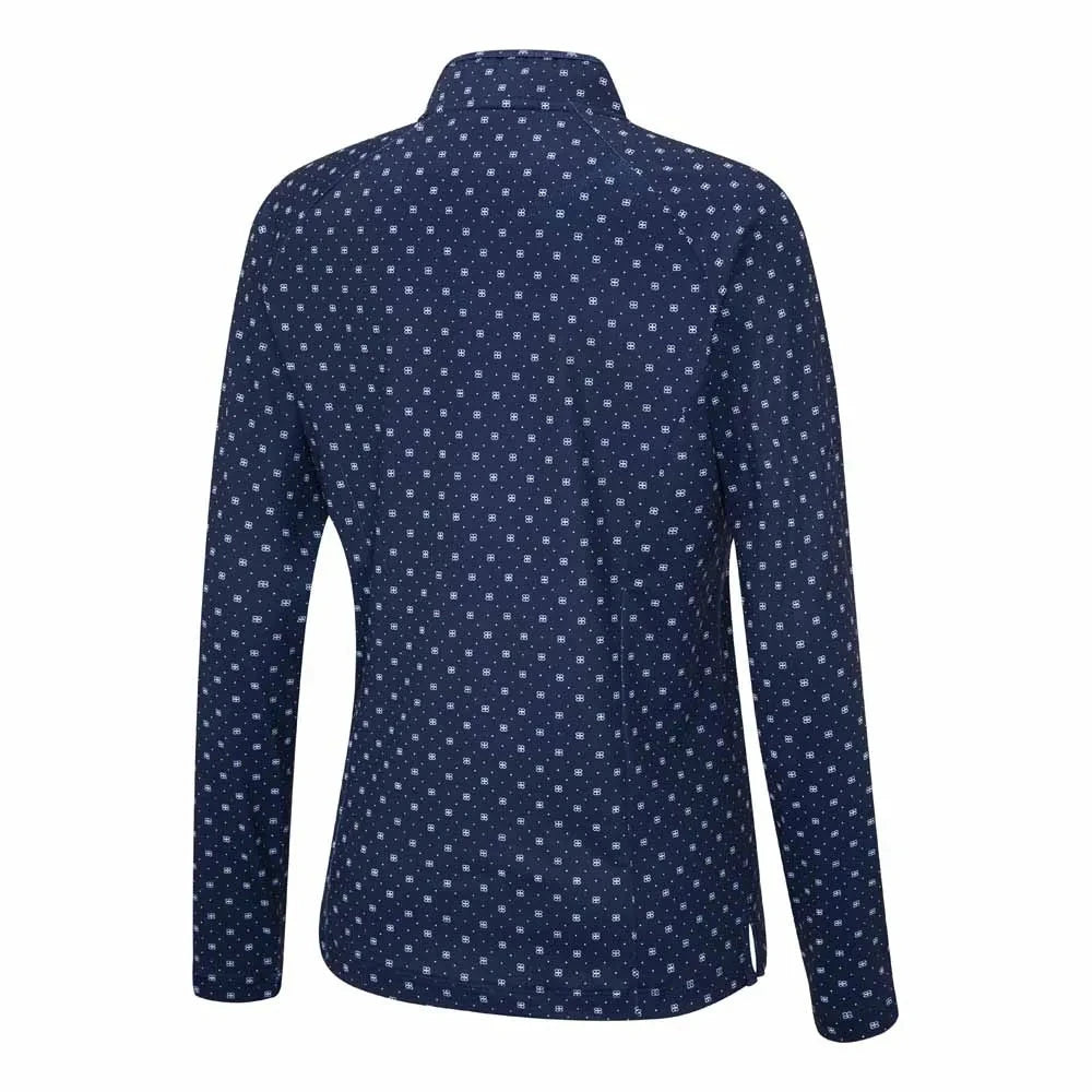 Sophisticated and sleek, the Arwen Ladies Long Sleeve Top in Micro Monogram print brings refined style to your performance wardrobe. Featuring a mandarin-style collar with zip opening, raglan sleeves for unrestricted movement, and an antibacterial finish for lasting freshness. The all-over monogram pattern adds a modern edge, while the PING logo on the right sleeve completes the look. Pair with tailored trousers or slim-fit shorts for a polished, versatile outfit.