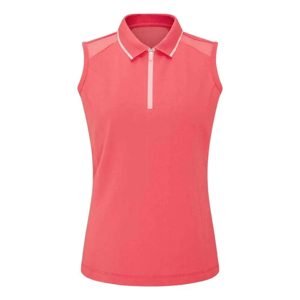 Make a bold impression with the Eben Ladies Sleeveless Polo in Paradise Pink. Crafted from high-quality pique fabric, it features sheer panels at the shoulders and back yoke for a feminine touch. The zip-neck opening and textured collar with contrast tipping deliver a sleek, sporty finish. Complete with the PING logo at the back, this polo combines vibrant style with technical performance. Pair with neutral-toned shorts or slim trousers for a striking, balanced look.