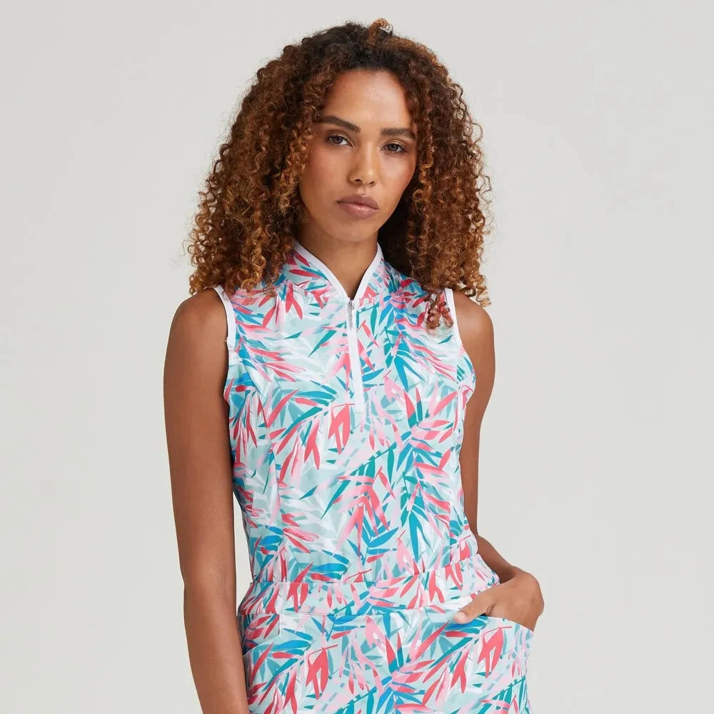 Capture the essence of summer with the Penola Ladies Printed Sleeveless Polo Shirt in Tropic Retreat.